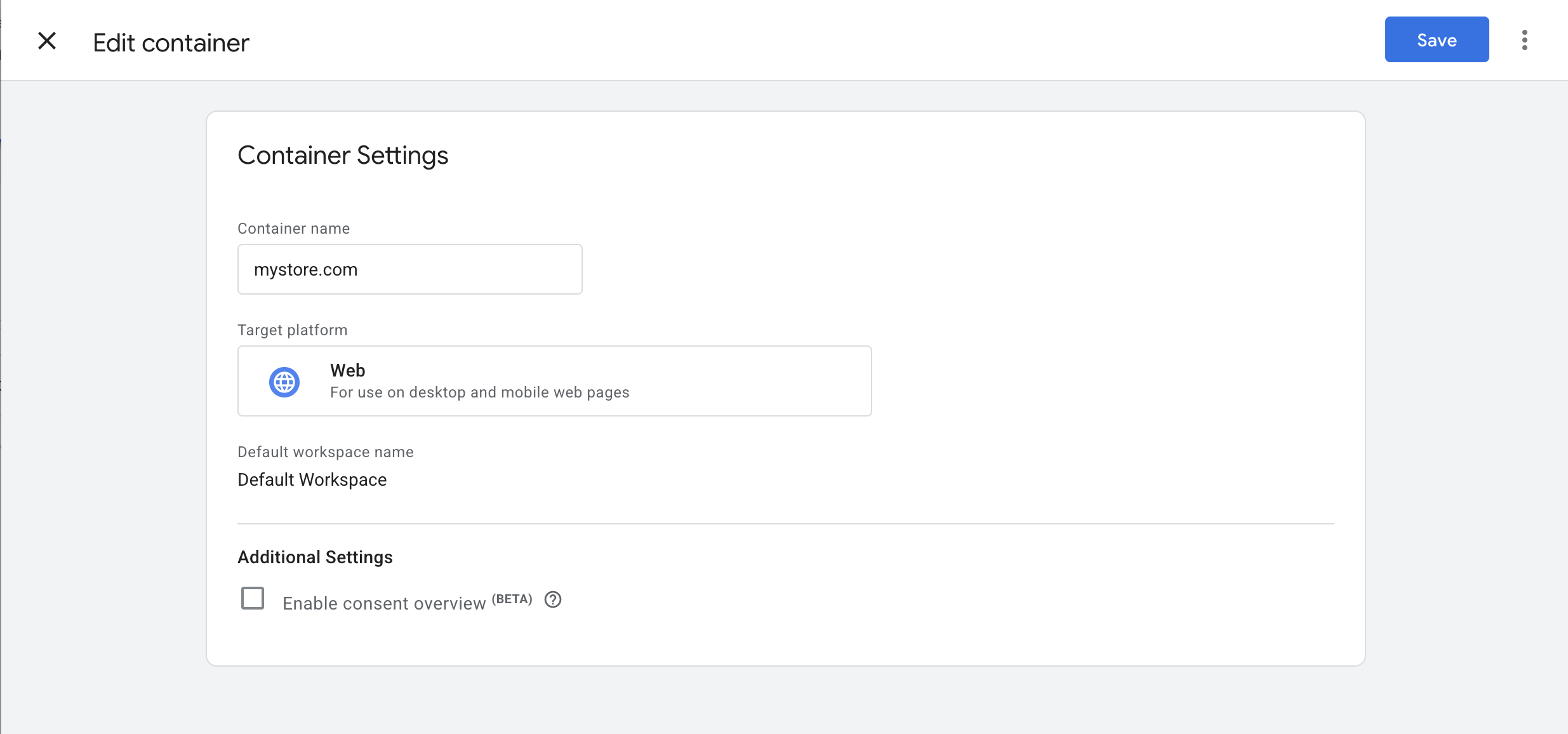 In your Google Tag Manager (GTM) account confirm that the container name matches the website you will be integrating with Friendbuy. The container name setting is located in the Admin tab > Container Settings > Container name field.