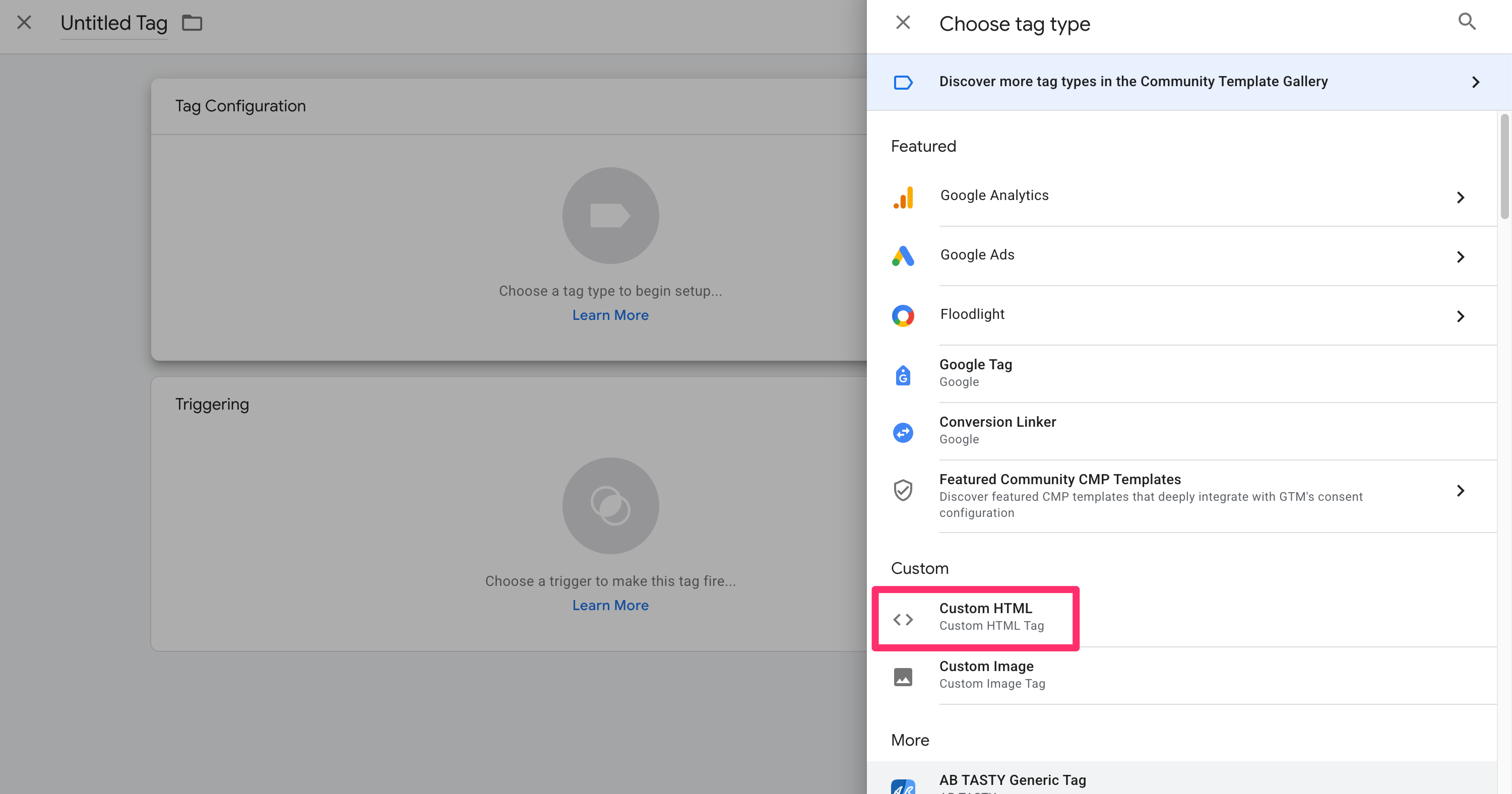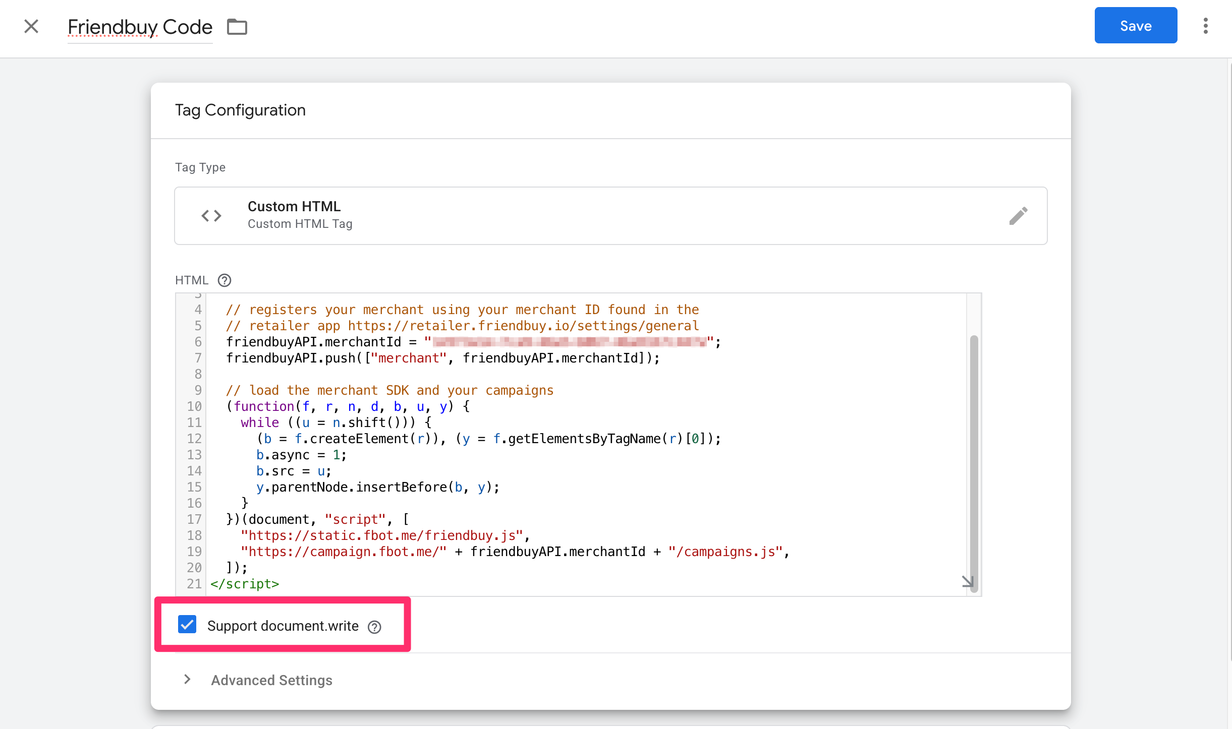 Paste the copied Friendbuy code into your GTM tag configuration HTML window. Enable the Support document.write setting and save.