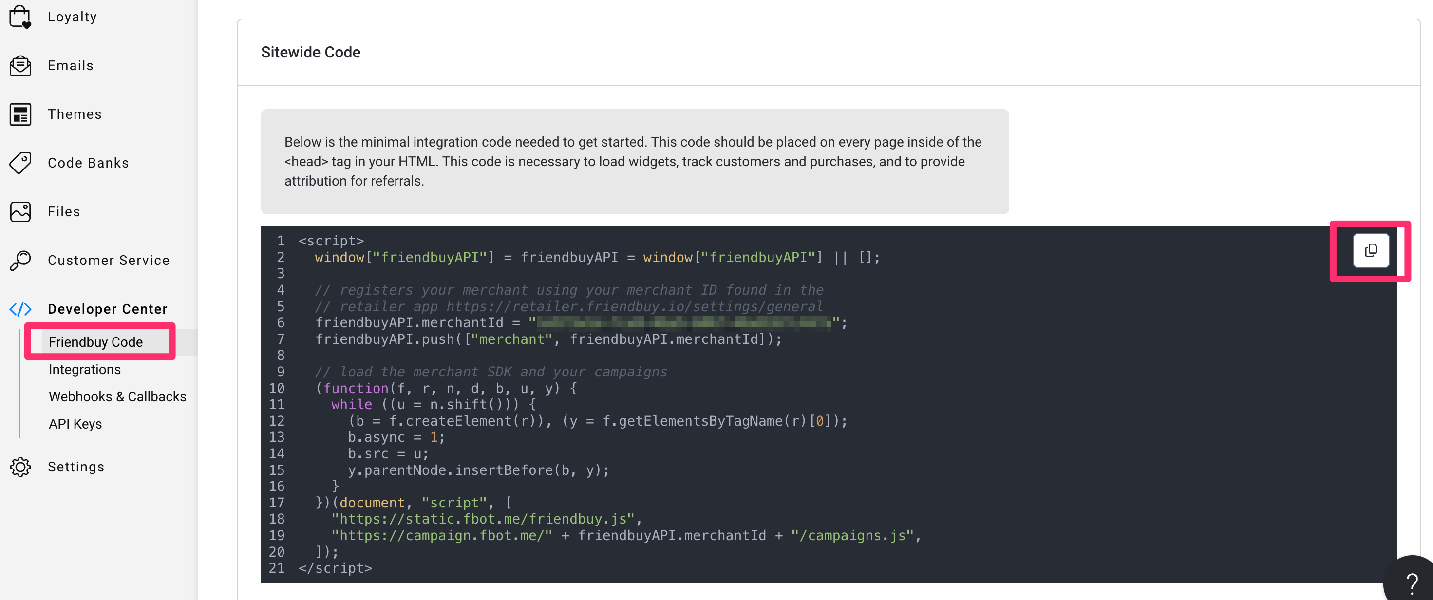 Access your Friendbuy Retailer account and navigate to the Developer Center tab > Friendbuy Code page. Copy the Friendbuy integration sitewide code exactly as it appears, there are no changes necessary.