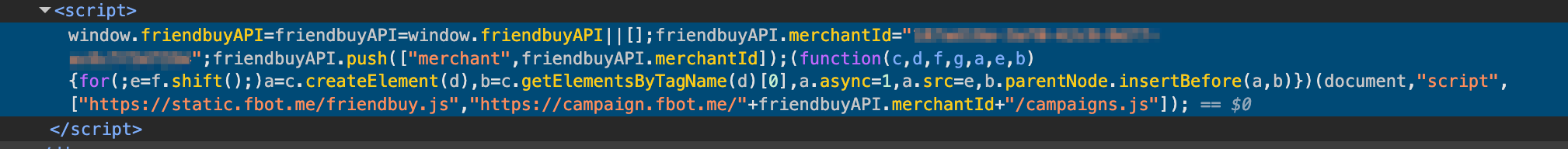 The Friendbuy integration code should now be available on your website! You can verify the script is present by navigating to your website, opening the dev console on your browser (right click > inspect > elements tab) and searching for the Friendbuy merchant SDK code.