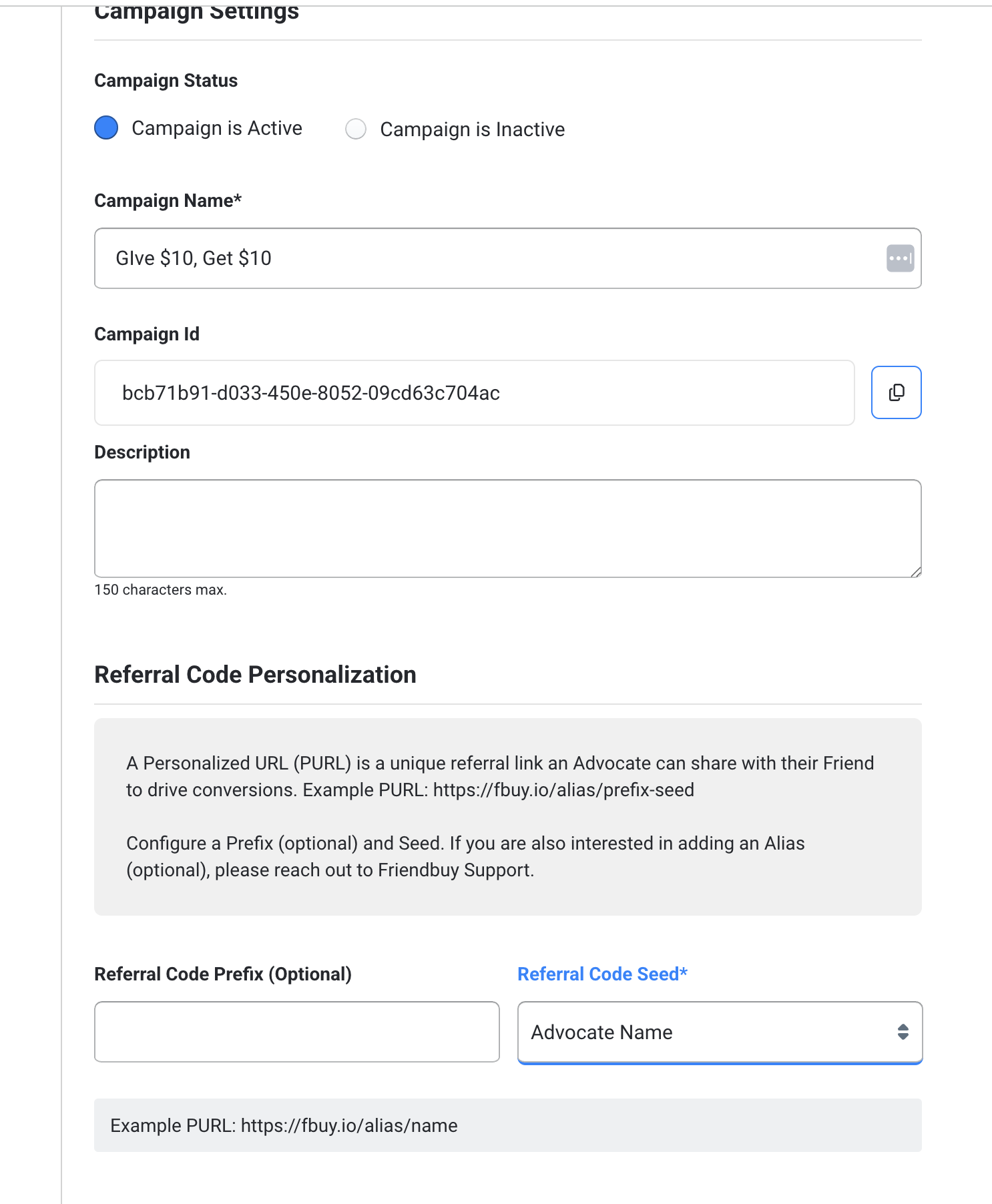 Each PURL will contain a Seed at the end of the URL. The Seed is set as the Advocate's name by default for all Referral campaigns (Ex: 12Gy840c). The Seed can be customized per Referral campaign to use either an Advocate's Name or Advocate's Email Address.