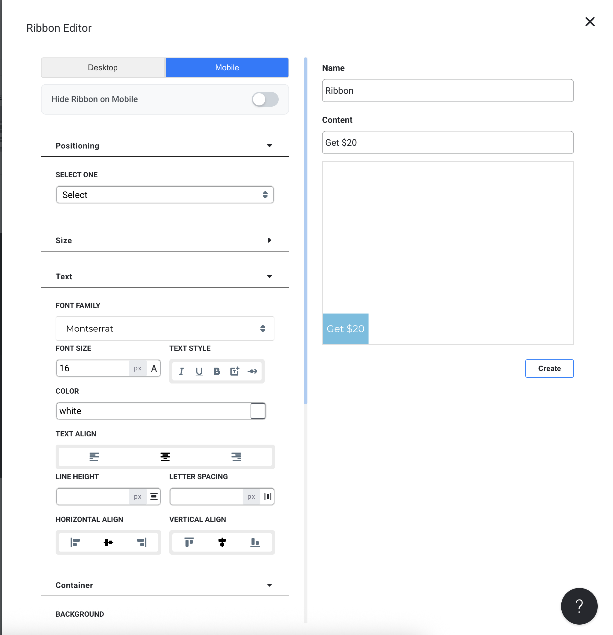 - Select a Ribbon template, which will then open the Ribbon Editor. In the editor, you can see an example design of your Ribbon as well as have the ability to customize the positioning, size, text, and color of the Ribbon. There is an optional Close-Out Button so customers can dismiss the ribbon.