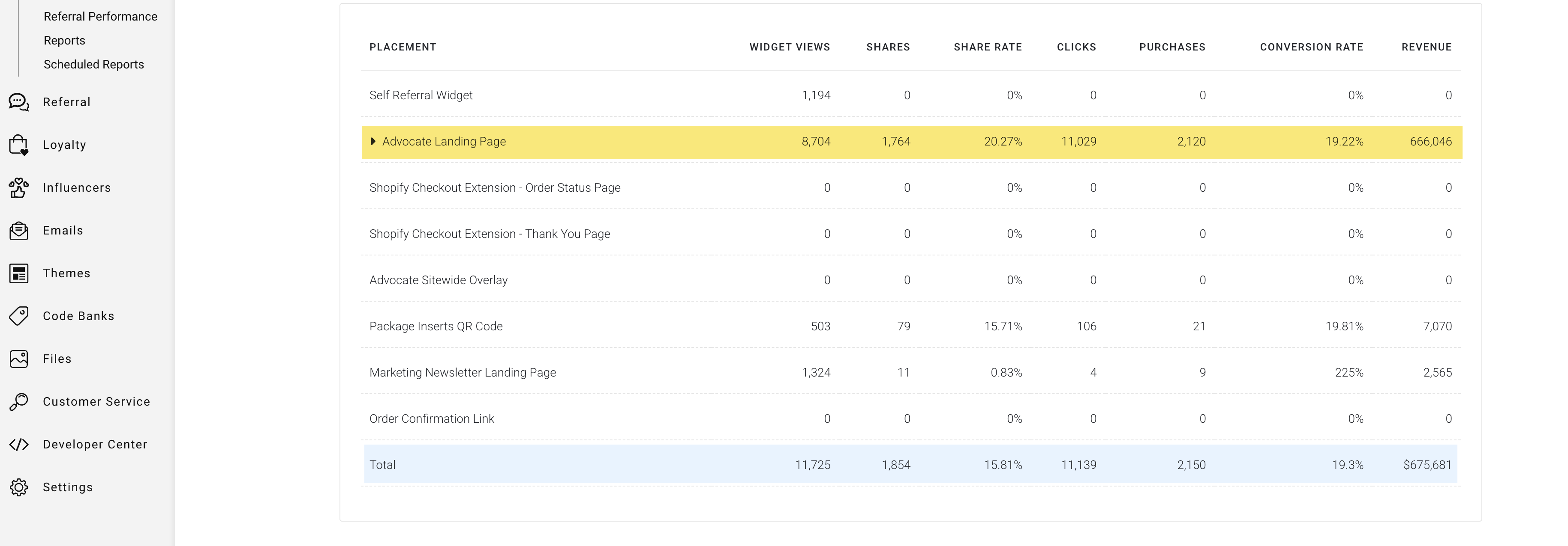 This is useful if you're driving advocates to your referral landing page from multiple channels (email, paid search, affiliate, etc.) and want to understand which sources are generating the most referral activity and revenue.
