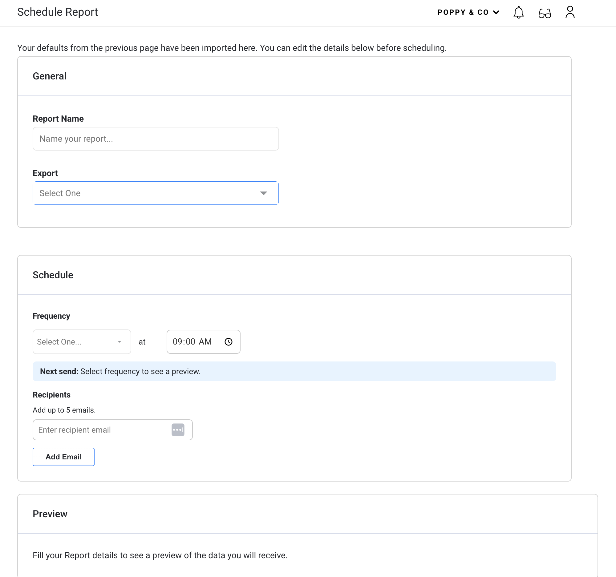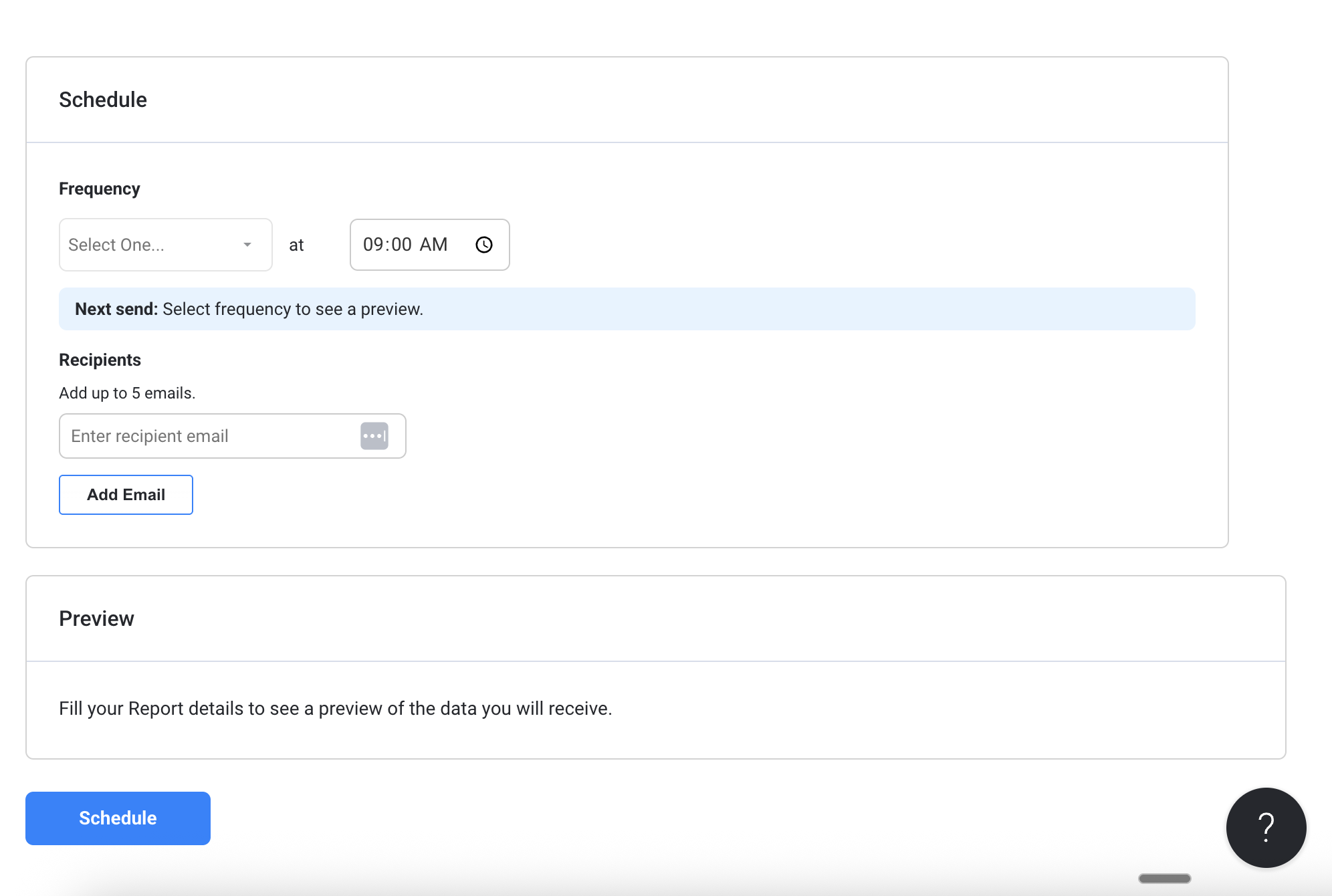 - Upon clicking the Schedule button, you'll be taken to a page where you can enter all the details for your scheduled report