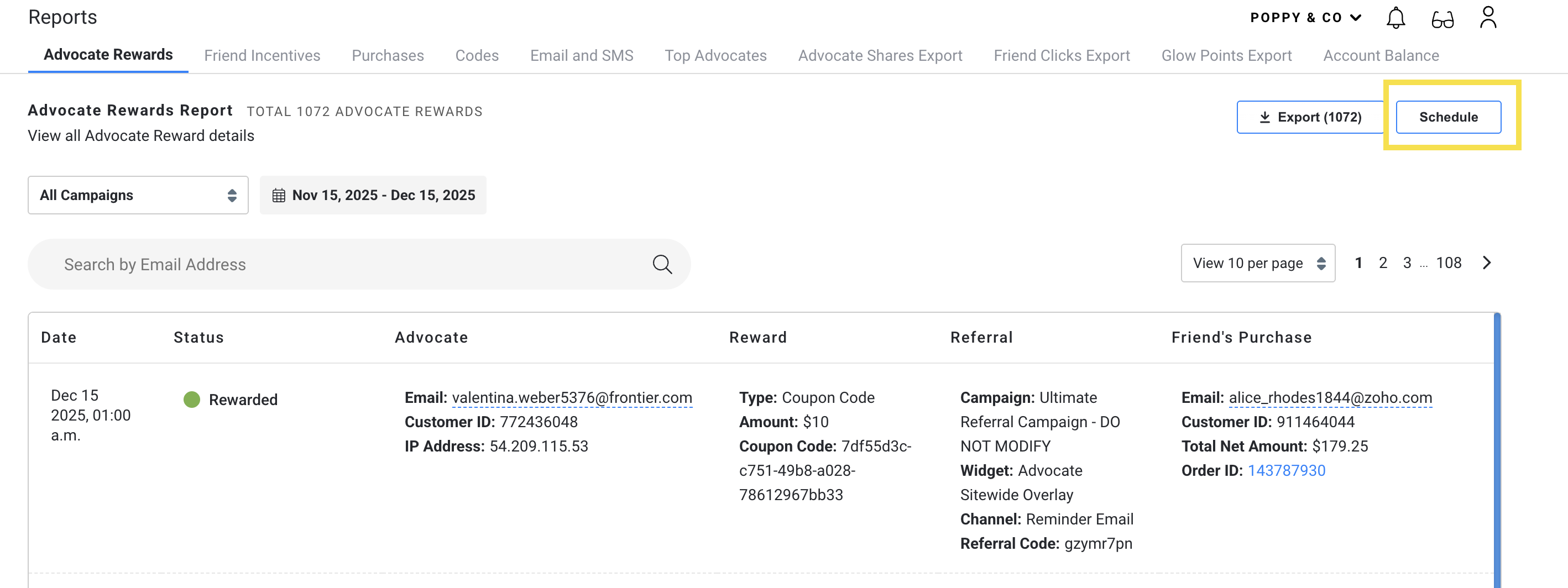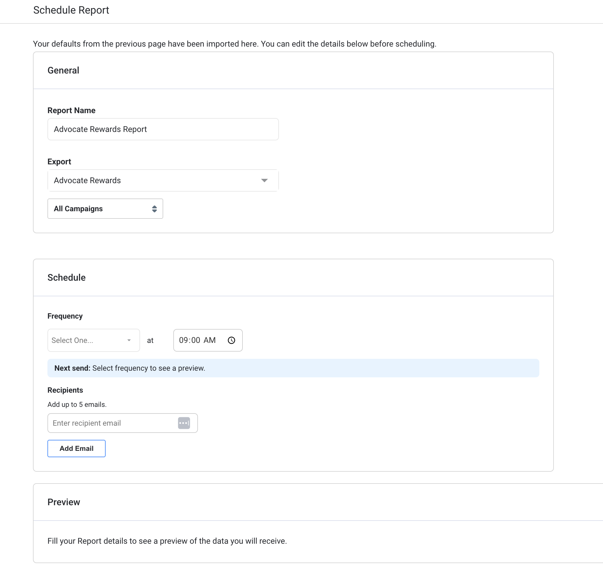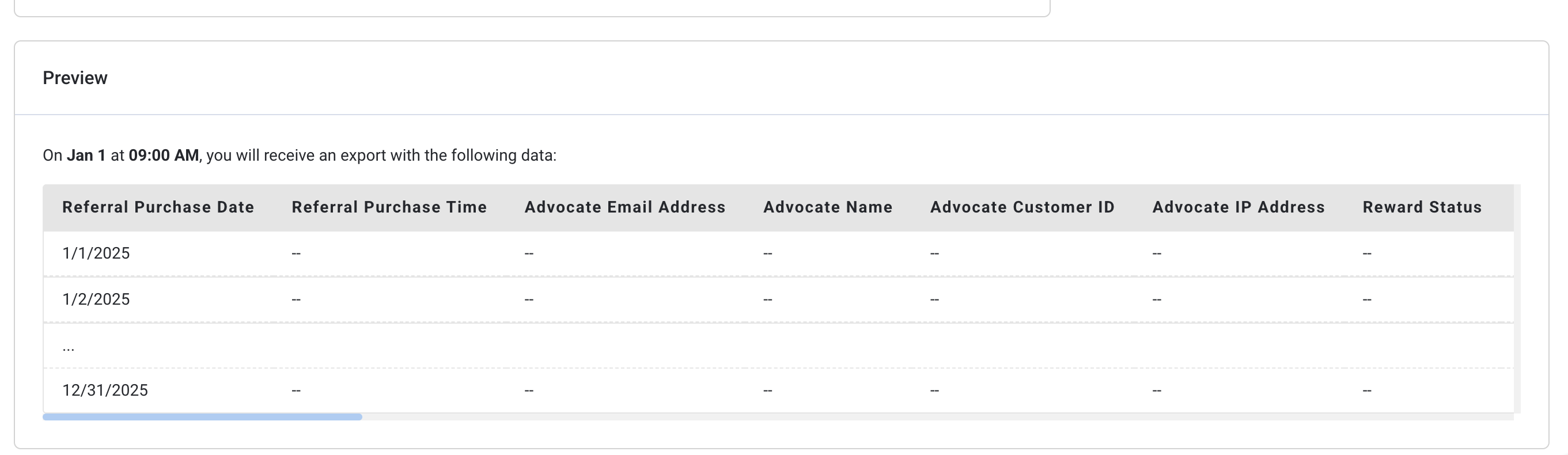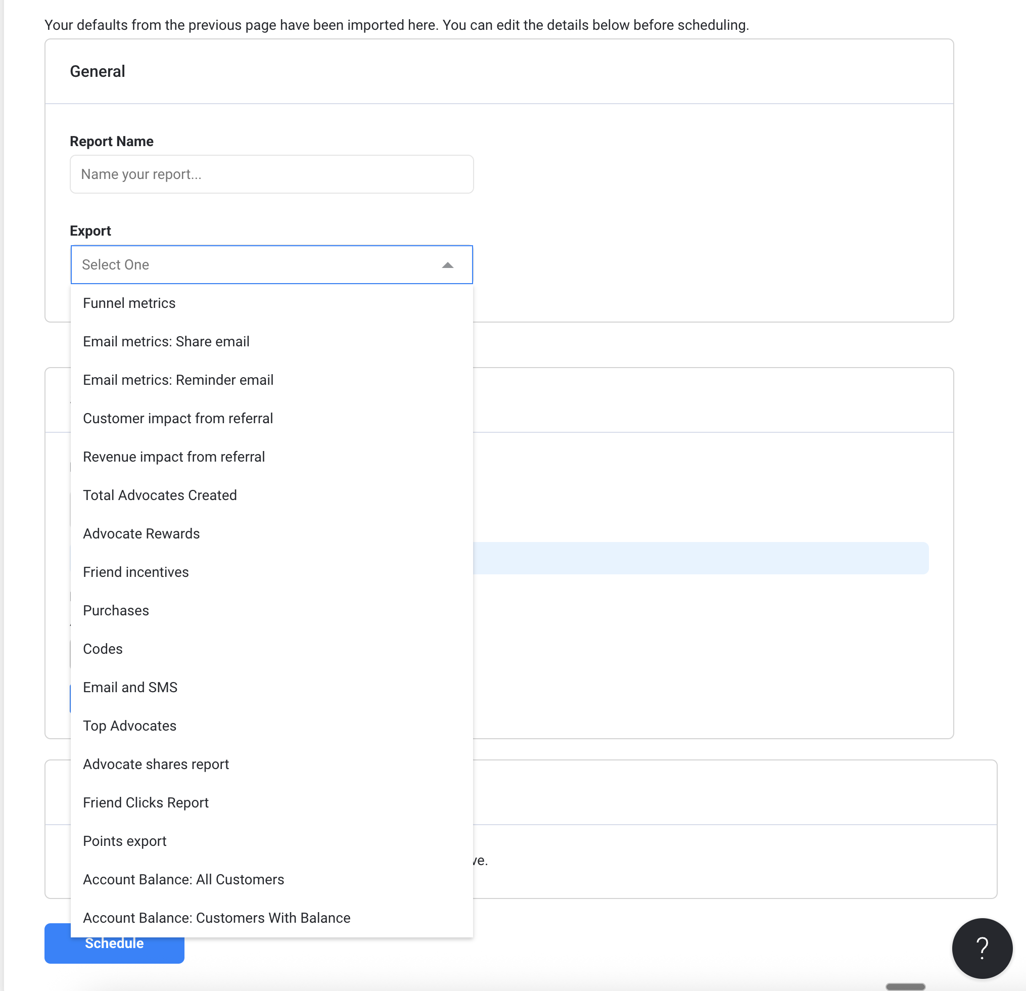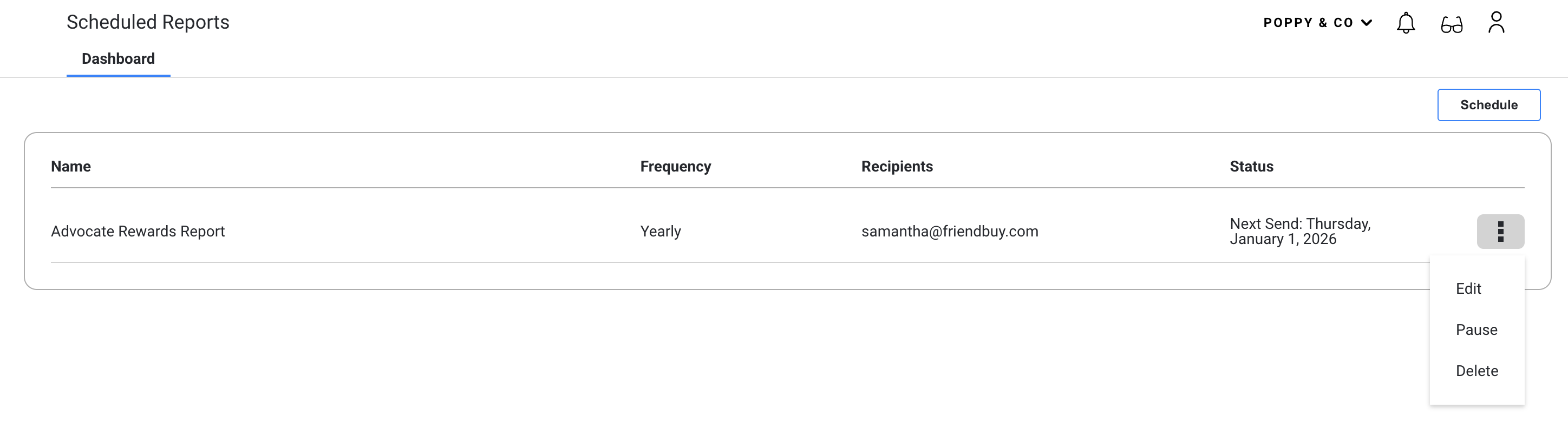 The Scheduled Reports feature lets you automatically receive referral and loyalty performance reports by email without manual exporting. This saves time, keeps your team aligned, and ensures fresh data on a regular cadence.