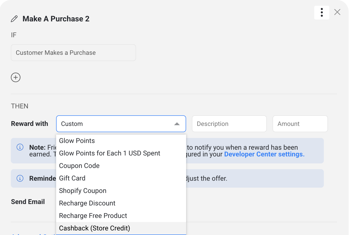- In the reward configuration under the Reward With drop-down, select Cashback (Store Credit)