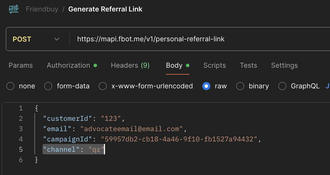 Make an API call to the/personalReferralLink endpoint. The body of your request should include, the customerId, email, campaignId and the channel. "Channel" should be set to "qr".